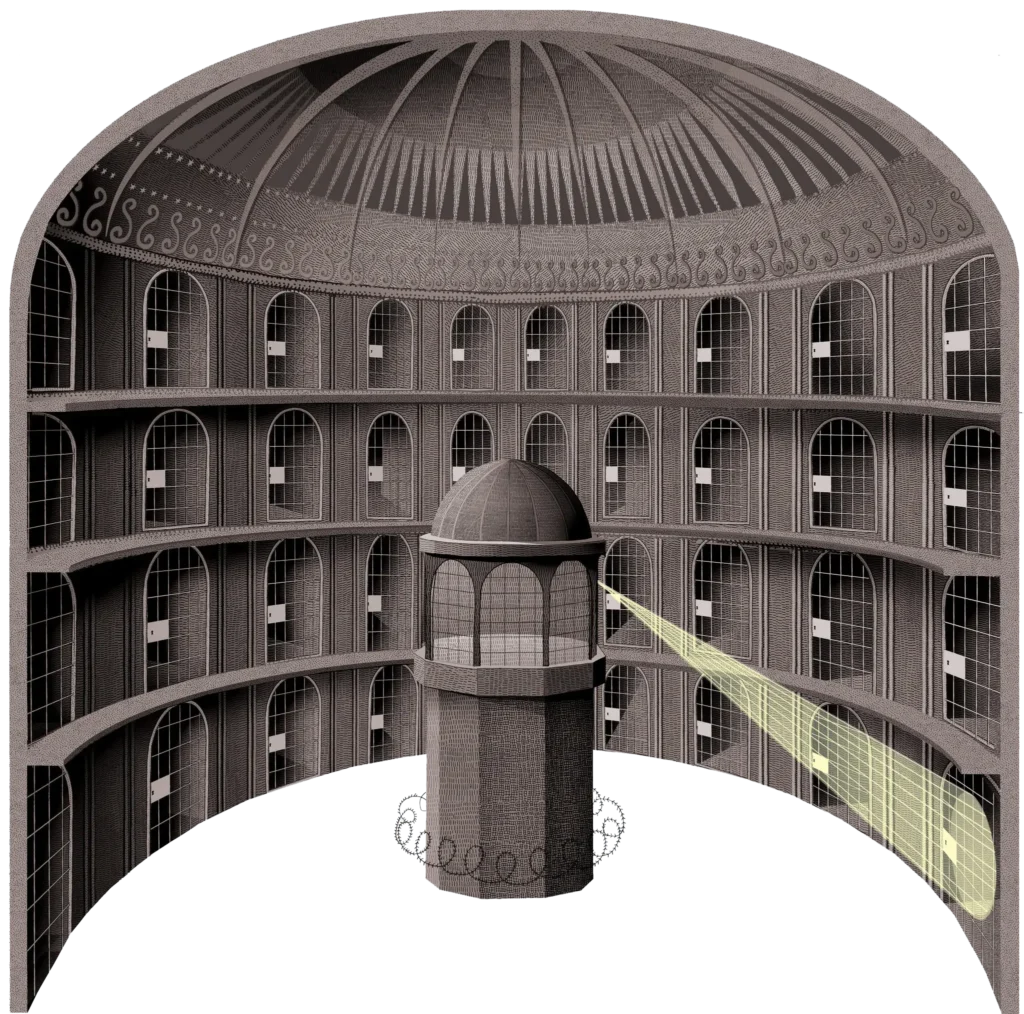 Una figura que me resulta muy interesante – y perturbadora a la vez – es la del panóptico. Michel Foucault (quien, curiosamente, falleció en 1984) le dedica un apartado entero en su libro Vigilar y castigar (1975). El Panóptico de Bentham es una figura arquitectónica que permite observar a los prisioneros de una determinada institución sin que estos se enteren si están siendo vigilados o no. En palabras de Foucault, el mayor efecto del Panóptico es “inducir en el detenido un estado consciente y permanente de visibilidad que garantiza el funcionamiento automático del poder. Hacer que la vigilancia sea permanente en sus efectos, incluso si es discontinua en su acción” (p. 233).